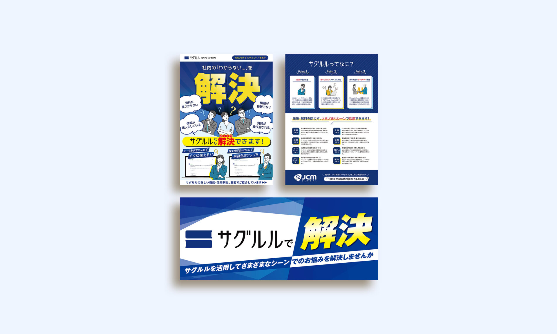 掲示・配布シーンを想定し、遠目でも「何を解決できるサービスか」が即座に伝わるよう、大きな見出しと文字のメリハリで要点を一目で伝える構成にしています。